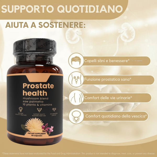 Presenta una potente miscela di estratto di frutto di Serenoa repens e un Complesso di Funghi specializzato noto per supportare il tessuto prostatico.