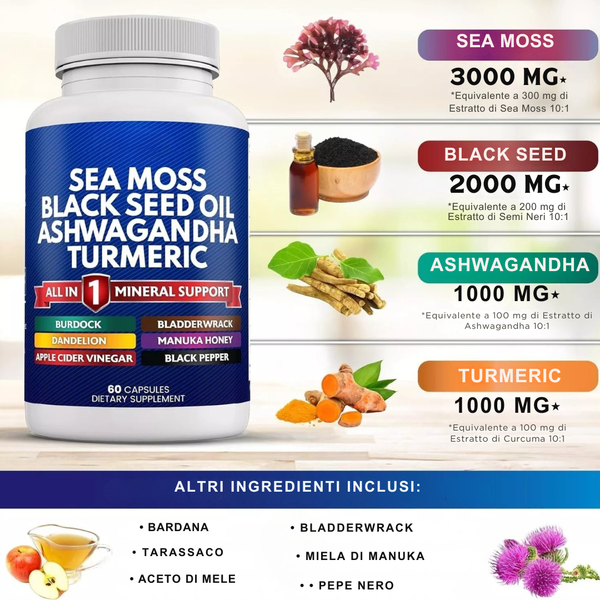 La nostra miscela unica combina Sea Moss, Ashwagandha e Olio di Semi Neri, offrendo un approccio completo alla salute che altri non forniscono.